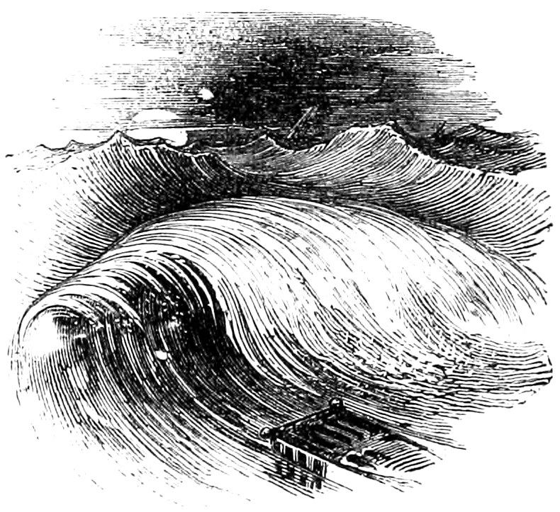 It was a fearful struggle for life that the brave seamen now engaged in, as, with parched lips and every nerve strained to its highest pitch of tension, they rose and fell with the green93 waves still running mountains high. It seemed almost hopeless to attempt to withstand any longer the fury of the sea, which broke over them in angry surges. As we have said, they had but a quart of water on board, and the bottles of spirits. It was a fortunate thing that young Edwards succeeded in getting hold of these and concealing them, for the probability is, that had the seamen given way to drink in their then excited state, raving delirium would have set in, and cutter and crew would soon have been at the bottom. The lad shall tell his own story, and he is worthy of lasting honour and remembrance for his part in it.