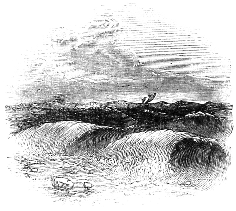 In a single moment the men in the boat seemed to take in at a glance all that transpired on board. They saw the stem of the vessel rise so high, that her keel was completely out of water as far as the foremast. The boatswain, the butcher, the baker, and the purser’s mate, it is said, had resolved to attempt their escape in the remaining boat over the cuddy, which was already provisioned and launched; but no sooner were these men ready to put off, than the sinking vessel sank beneath them, making, in her descent, a very whirlpool of angry and confounding waters, and the escaping ones in the cutter saw their comrades swallowed up83 quickly and disappear with the lost ship. They saw young Angell going down while standing at his old post of duty: for a moment they saw two men with life-belts struggling amid mountains of water: they rose with the waves, and then descended into the deep, deep grave which the sea formed for them, and then not a trace of men or of ship was to be seen! The gale thundered so furiously, that if there was a cry from the sinking ship, it was not heard. Once more to the bottom of the Bay of Biscay had gone a noble ship and valuable cargo; but O! saddest of all, more than two hundred forms, that a few days before had been seen sitting in mirth and friendliness around many an English fireside, had gone down too. And once more the billows rolled on, curling their monstrous heads, as if in contempt of the beings who would seek to master them when once they rose in their terrible might and majesty.