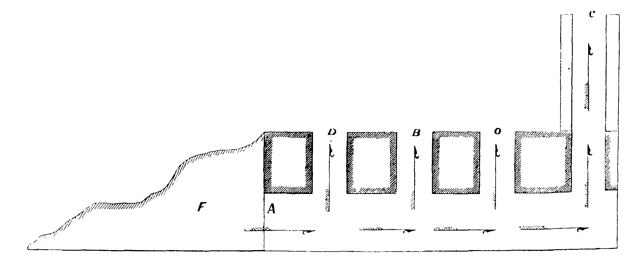 In a clayey soil, the plan adopted by the salt boilers of New York is perhaps the neatest, most economical, and most convenient that can[Pg 4] be devised. They dig a hole about three feet square and two feet in depth, generally in the slope of a hill. On one side they run a shaft laterally, about one foot square and six feet in length, and one foot from the surface of the ground. At the extreme end they sink a shaft vertically, and form a chimney; and at equi-distances they pierce three holes of sufficient diameter to prevent the kettles from slipping through. By this mode the kettles can be placed over the fire to boil—or on either side, to simmer—with less difficulty than by any other means.