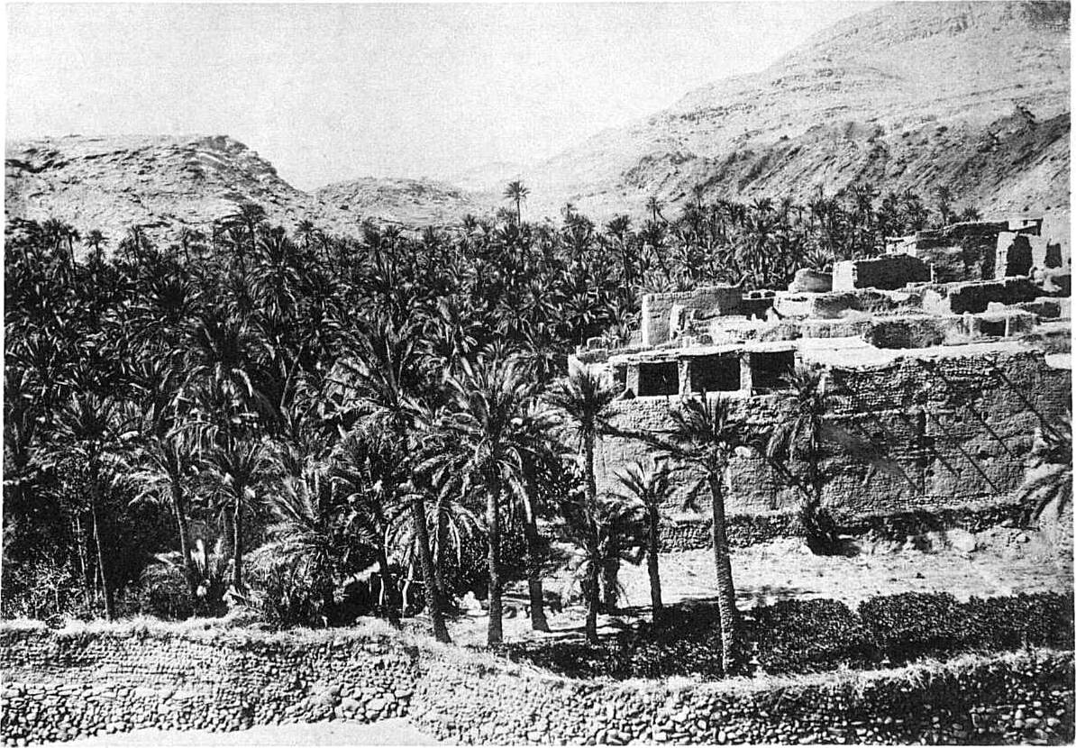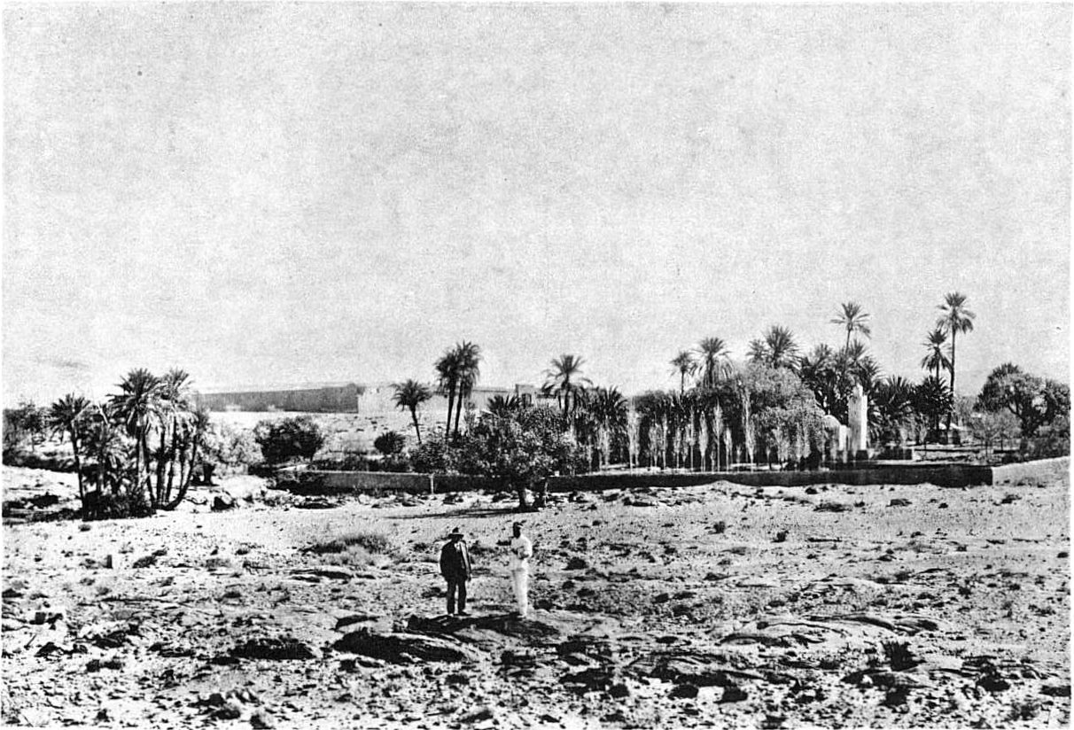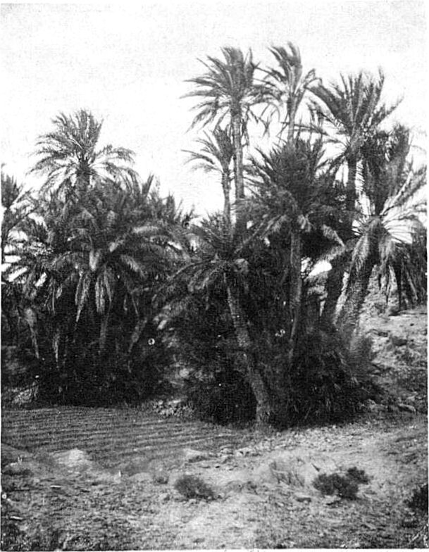 Groupe de Phœnix dactylifera. Les plus grands exemplaires mesurent 20 à 25 m. de haut ; au pied, un champ préparé pour la culture de l’orge.