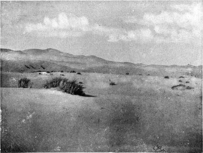 Steppe sablonneux près des Chotts. Les grosses touffes sombres sont formées par le Peganum Harmala et par l’Erodium glaucophyllum ; les touffes de Graminées sont formées par les Stipa gigantea et Lygeum Spartum.