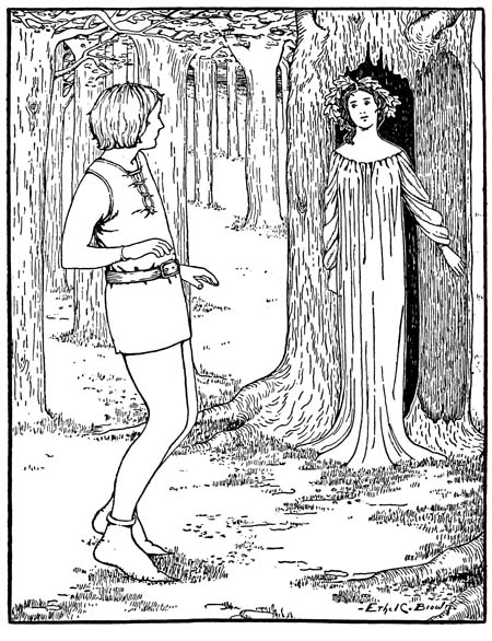 “They dressed as I do,” said the Fairy. “But sometimes their faces were painted green or red or blue. And I could see no good in that. Sometimes they wore tassels of hair at their belts. Ugh! I did not like that fashion. Sometimes their hands were red, and when they went away the waters of my spring were stained. Ugh! Neither did I like that. But they were brave and strong and[116] noble. I loved the Red Men, for they lived out of doors in the sweet sunlight, as I did. They loved the fresh air and the blue sky and the green grass. They would have no stifling roof over their heads to shut out the sky; no four walls to keep off the fresh air. Ugh! I cannot breathe in a house. I stifle! I choke!”