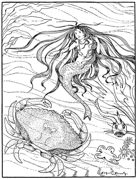 Now there was one creature who had overheard the talk between Wavilocks and her father, and his little eyes gleamed wickedly at mention of the starry necklace. The Crab was the most evil of all the sea-creatures, and old Triton had forbidden Wavilocks ever to play with him or listen to his words. The sea-folk hated the Crab because of his mischievousness and because of his wicked history. He had not always been the sneaking nuisance of the sea. Once, long before, he had lived in the sky. He was a cousin of the great Sky Crab, the guardian of the star jewels, and once he too had helped to take care of them. But because he had tried to steal a few for his own use, the big Sky Crab had indignantly[10] cast him out of heaven, down to the lowest depths of the sea. Oh, yes, the Crab knew all about the stars which Wavilocks so longed to own!