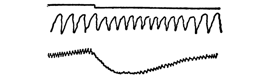With the detective’s half-suspicious, half-respectful assistance, the psychologist stretched across the end of the room a white sheet about ten feet long, three feet high, and divided into ten rectangles by nine vertical lines. Opposite this, and upon a table about ten feet away, he set up a small electrical contrivance, consisting of two magnets and wire coils supporting a small, round mirror about an inch in diameter and so delicately set upon an axis that it turned at the slightest current coming to the coils below it. In front of this little mirror Trant placed a shaded electric lamp in such a position that its light was reflected from the mirror upon the sheet at the end of the room. Then he put down a carbon plate and a zinc plate at the edge of the table; set a single cell battery under the table; connected the battery with the coils controlling the mirror, and connected them also with the zinc and carbon plates.