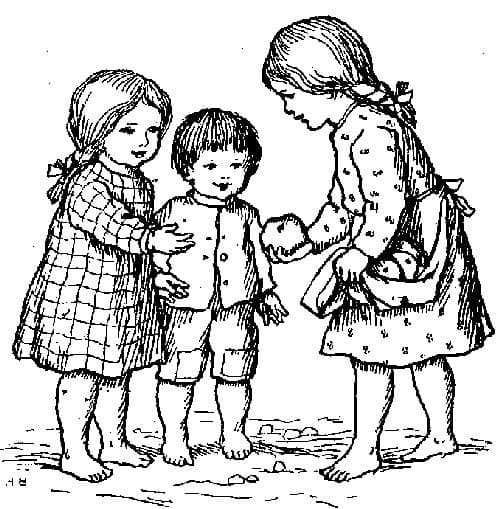 So ging sie nach dem Frühstück mit Hänschen in den Garten, zog sich und ihm große Schutzschürzen an und fing an, mit ihm ein Gärtchen aus Sand und Steinen und mit Gänseblümchen anzulegen. Das mußte man sie sonst sehr oft heißen,[S. 20] weil sie viel lieber mit andern Kindern spielte, als mit dem kleinen Bruder. Aber sie wollte ja nicht mehr unfolgsam sein, der Mutter zulieb. Sie wurden beide ganz vergnügt und merkten kaum, daß schon die Kirche aus war und die Mutter hinter ihnen stand und ihnen zusah.