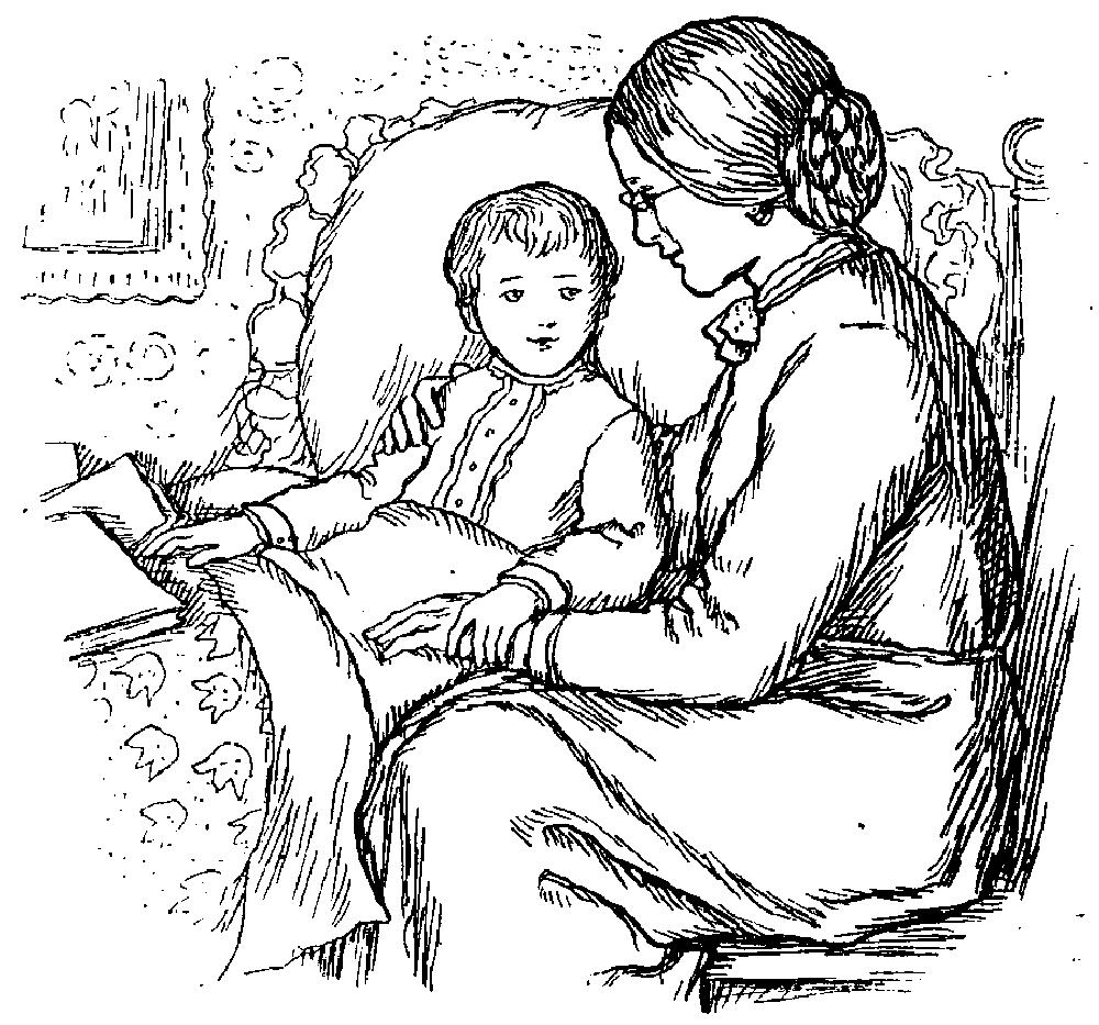 In einer großen, freundlichen Schlafstube standen vier Bettchen, immer eins etwas größer als das andere. Und in den Bettchen lagen vier Kinder, auch immer eins größer als das andere. Sie schliefen aber noch nicht, obgleich sie schon ihr Nachtgebet gesprochen hatten, sondern jedes sah ganz erwartungsvoll nach der Türe. Denn die Mutter war von Kathrine, der Köchin, in die Küche geholt worden, und ehe man einschlief, mußte sie noch einmal kommen und jedem Kind einen Gutenachtkuß geben. Das konnte man sich gar nicht anders denken. Hänschen, der kleinste, rieb sich immerfort die Äuglein, denn die wollten ihm zufallen; da kam die Mutter herein. »Wer wacht noch von meinen kleinen Schelmen?« fragte sie. »Ich, ich,« riefen alle und jedes wollte die Mutter zuerst bei sich haben. »Mütterlein, ich habe dich doch am aller-allerliebsten,« sagte Gustav. Er war schon zehn Jahre alt und ein fleißiger Schüler. Und er machte heimlich einen schönen Lampenschirm für die Mutter, den sollte sie morgen bekommen; deshalb dachte er, er habe die Mutter am liebsten, denn so etwas konnten die Kleinen nicht tun. Aber diese wollten sich's nicht gefallen lassen; sie wollten die Mutter auch am liebsten[S. 18] haben, und es hätte beinah' Streit gegeben unter den Geschwistern.