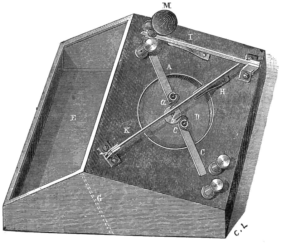 M. Pollard’s Microphone.—This microphone, which has been arranged in several ways, essentially consists of a carbon rod kept in a horizontal position by a wire, and resting on two other vertical carbons. The upright of the arm which holds the wire can revolve together with this arm, and is thus able to regulate the pressure of the horizontal carbon on the two vertical carbons. It appears that this instrument is extremely sensitive, and that the regulation effected on the two contacts is better than when it is effected on one only. It is fair to add that M.357 Voisin previously sent me the sketch of a somewhat similar arrangement.