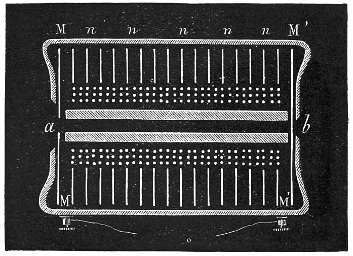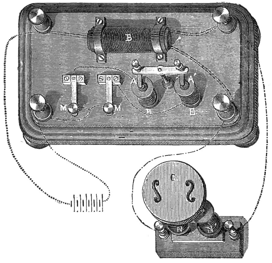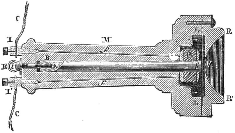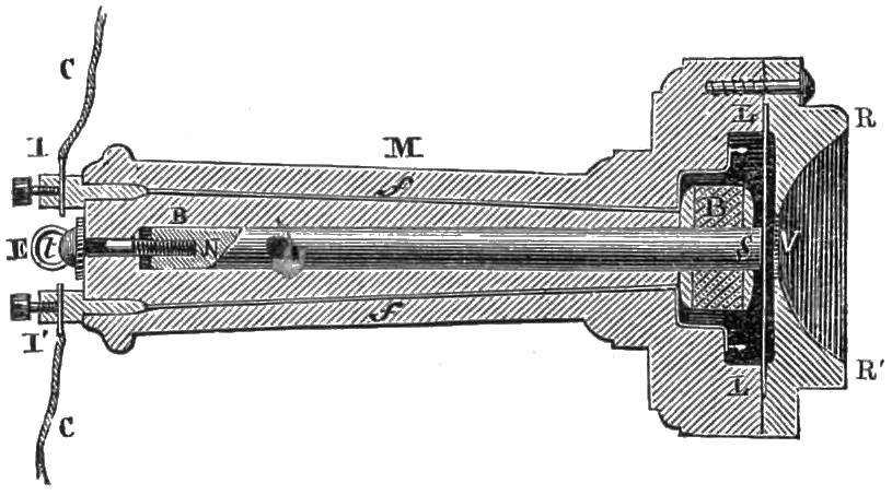 He observes that a singular fact has been discovered by several persons, who have ascertained that not merely non-magnetic and non-conducting bodies can be substituted for the diaphragms of receiving telephones, but that they will act without a diaphragm at all. In this case it is evident that we have to do with the sounds discovered by Page, and that they are produced by the magnet itself, in which each molecular movement constitutes the source of the sound produced. This sound becomes articulate as soon as its increase and decrease can follow the increasing or decreasing action of the voice which produces it at the sending station. It is certain that when the transmitted currents are due to the action of the Bell diaphragm, the sounds due to the Page effects ought to correspond with those which would be given by iron diaphragms adapted to the receiving instruments; so that, when a telephone has an iron diaphragm, there are in fact two voices, that of the diaphragm, which is strong, and that of the magnet, which is weak. When a disk of wood is substituted for one of iron, it acts as a sounding board for the Page effect, and when the disk is of metal, induction is developed by the magnetic modifications, and tends to produce vibration, thus developing a third source of sound, which may be called the Ampère effect. Finally, a fourth source of sound may result from the induced effects produced in the wire itself in consequence of changes in the intensity of current. These sounds, first observed by M. de la Rive, have since been studied by Mr. Fergusson of Edinburgh (vide ‘Telegraphic Journal’ of November 1, 1878).