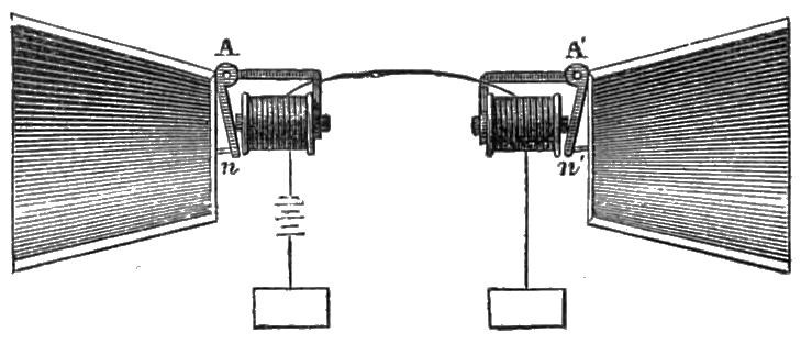 M. Ader has likewise obtained a very distinct reproduction of speech at a distance of two or three yards from the instrument by inserting between the two stretched membranes of two tambourines a bent wire which acts as a spring and passes through an electro-magnetic coil. Under these conditions, magnetisation of the wire in a greater or less degree affects its elasticity and causes vibrations which are magnified by the membranes, and transmitted sounds are reproduced with intensity. Unfortunately articulate speech is less distinct with this system than with the one I described before.