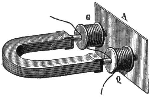M. Ader was also able to reproduce speech by using362 a simple coil without a magnetic core, but in this case the spirals must be open, and not pressed together. If they are steeped in gum, no sound is heard, but speech will become instantly audible if a wire or a magnetised needle is inserted in the coil, or even if a second metallic helix is placed in the circuit: always provided that one of the ends of these magnetic organs rests upon, or is fastened to, the board on which the coil is fixed.