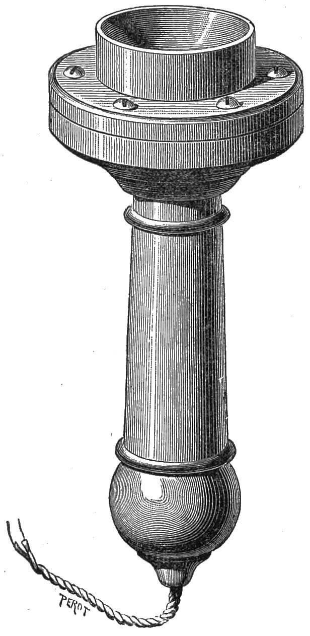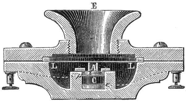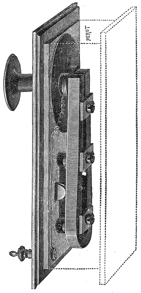 In this new system, which is only an improvement on Bell’s square model, the horseshoe magnet is of a peculiar form, which renders it more powerful. It is formed of a kind of half-circle of magnetised steel, with its two ends turned back, so as to form a diameter of the circle, only this diameter is divided in the centre: so that the two poles of the magnet are placed one before the other, as in Faraday’s electro-magnet. The poles are tipped with iron, terminating in front in two thin iron plates, on which are placed the electro-magnetic coils, which are oblong, and constitute the magnetic core. The diaphragm, thicker than the ordinary diaphragms, is of tin, and is fixed firmly to the edges of the circular box359 which encloses the whole, and which forms a kind of sounding-box. The box is made of copper, and the diaphragm is so firmly fastened to it as to become homogeneous with it, and to give out a sound when the box is touched, which is not the case in ordinary telephones. This is one of the conditions which make the instrument a better conductor of sound. The magnet is also much more powerful. It is magnetised by a current from a powerful Gramme machine, which acts upon it for almost twenty minutes. The instrument has, strictly speaking, no mouthpiece: the lid of the box which supports the diaphragm, and is separated from it by a space of two millimètres, has merely a hole bored in it above the centre of the diaphragm, and into this hole either a tin trumpet, 50 centimètres in length, is screwed, when the instrument is required to reproduce or transmit speech to a distance, or an acoustic tube when it is to be used like an ordinary telephone. The remarkable part of the system is that the instrument can itself give a very loud call by only breathing into it instead of speaking.