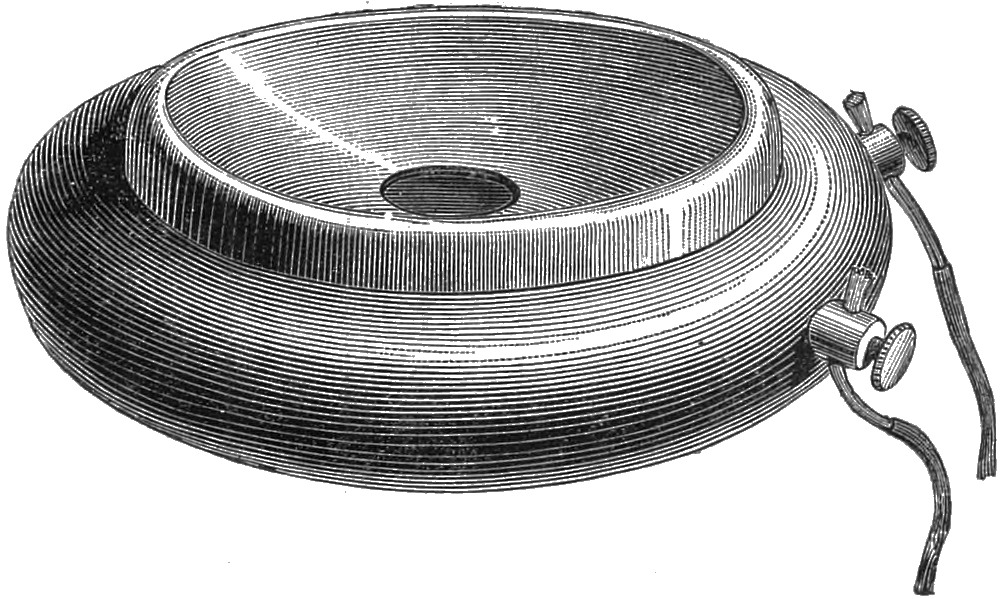 M. Ader’s Electrophone.—M. Ader has recently constructed a remarkable telephonic instrument, which reproduces speech and song in a quite exceptional and simple way. It consists of a drum 15 centimètres in diameter, covered with parchment at one end only. Six small tin armatures, one centimètre in length and two millimètres in width, are fixed in the centre of the parchment in a circle six centimètres in diameter. Six microscopic electro-magnets, whose distance from the armatures can be regulated by a screw, are placed opposite the armatures within a wooden circle. The magnets are horseshoe, with branches 12 millimètres long and 4 millimètres in diameter, including the coils, and the magnetic core is 1½ millimètre thick. They are all in connection, and act simultaneously under the sole influence of the battery current. The sender is the same as that of M. Ader described before. With this instrument speech may be heard at a distance of six or seven358 yards, and songs are much more distinctly heard than in the singing condenser. Owing to the simplicity of the arrangement, the instrument is not costly.