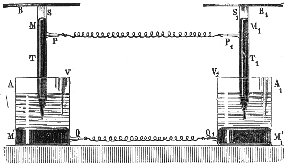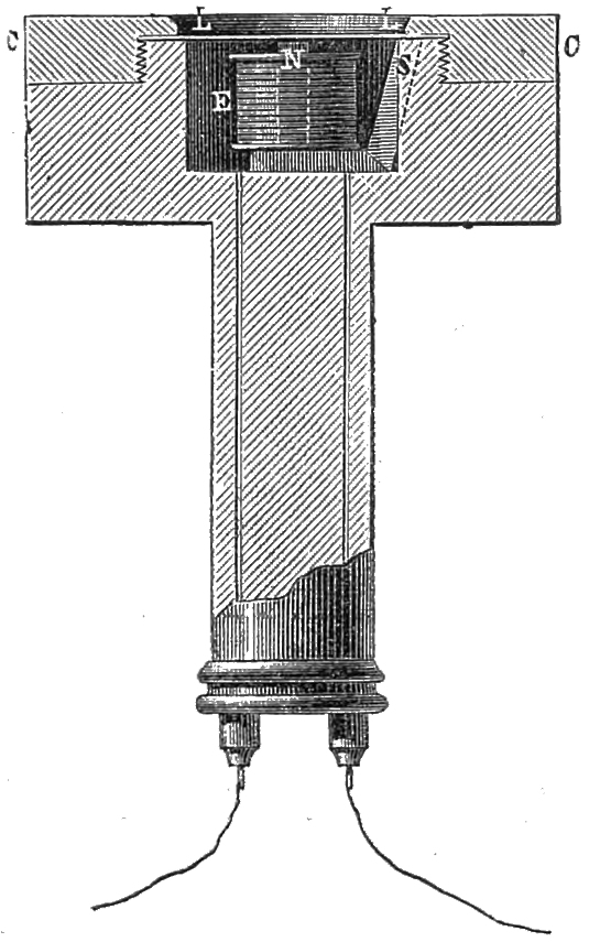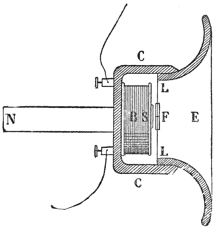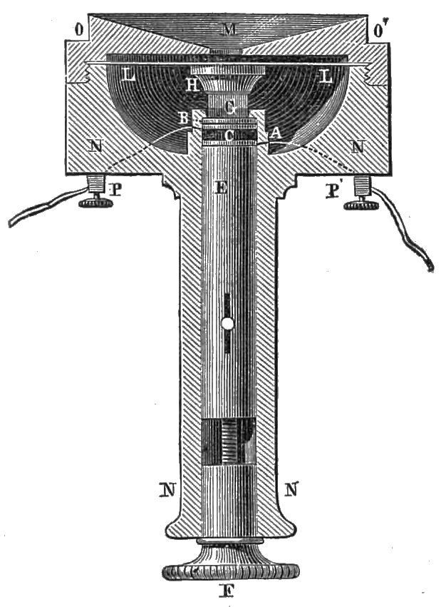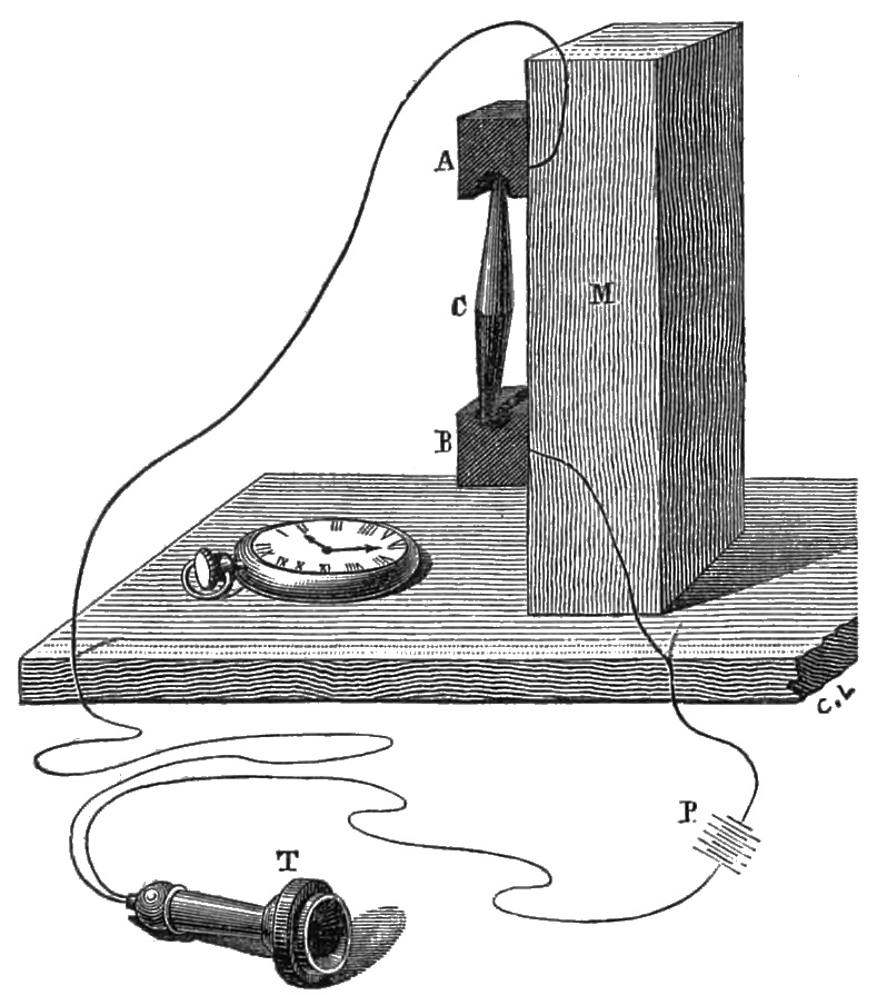 12 Mr. Warwick describes his experiments as follows: ‘The magnets employed were nearly of the usual size, 1½ inch in diameter, and nearly eight times as long. At first I employed iron disks, but I found them to be unnecessary. When I had discarded them, I tried several substances: first a thin disk of iron, which answered perfectly both for sender and receiver. A disk of sheet iron, about ⅒ of an inch in thickness, did not act so well, but all that was said was quite understood. In making experiments with the disks, I simply placed them above the instrument, without fixing them in any way: the wooden cover and the conical cavity were also laid aside, because the transmission and reception could be effected as well without them. This part of the instrument seems to be superfluous, since, when the disk is simply placed level to the ear, the sound seems to be increased by being brought nearer. Although iron acts better than anything, it appears that iron disks are not absolutely necessary, and that diamagnetic substances also act perfectly. I wished that my assistant, who was at some distance, and could not hear any direct sound, should continue his calculations. I took away the iron disk and placed across the instrument a wide iron bar, an inch thick. On applying my ear to it, I could hear every sound distinctly, but somewhat more faintly. A piece of copper, three inches square, was substituted for it: although the sound was still distinct, it was fainter than before. Thick pieces of lead, zinc, and steel were alternately tried. The steel acted in almost the same way as the iron, and, as in the other cases, each word was heard faintly but distinctly. Some of these metals are diamagnetic, and yet the action took place. Some non-metallic substances were next tried; first a piece of window-glass, which acted very well. The action was faint with a piece of a wooden match-box; but on using pieces of gradually increasing thickness the sound was sensibly increased, and with a piece of solid wood, 1½ inch in thickness, the sound was perfectly distinct. I next replaced it by an empty wooden box, which acted very well. A piece of cork, ½ inch thick, acted, but somewhat faintly. A block of razor-stone, 2 inches thick, was placed upon the instrument; and, on applying the ear to it, it was quite easy to follow the speaker. I then tried to hear without the insertion of any substance, and, on applying my ear quite close to the coil and magnet, I heard a faint sound, and on listening attentively I understood all that was said. In all these experiments the sounds were perceived, but the sounds transmitted or attempted did not act precisely alike. The sound of a tuning-fork, placed on the iron disk itself or on the case of the instrument, was clearly heard: thin iron disks were more effective for articulate speech. With other substances, stone, solid wood, glass, zinc, &c., the sound of the tuning-fork was heard, whether it rested upon them, or the vibrating fork was held above them. These substances were not adapted for transmitting the sound of the voice. These were all laid aside, and the sounding instrument was held directly above the pole of the magnet: the sound was clearly heard, although there was nothing but air between the end of the magnet and the tuning-fork. The sound was perhaps less intense when the tuning-fork was held directly above the pole, than when it was at the end of the magnet. I next tried if my voice could be heard with this arrangement. The result was rather doubtful, but I think that some action must have taken place, for the tuning-fork was heard when it was simply vibrated near the pole. The effect of the voice can only have differed in the degree of intensity: it was too faint to be heard at the other extremity. I repeated these effects; I assured myself of them, and I succeeded in transmitting sounds distinctly on the pole without a disk, and, on the other hand, by applying my ear to the instrument, I was able to hear distinctly all that was said, although there was no disk.’
