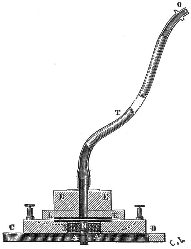 Although the words pronounced by this machine are distinct, they are spoken in a uniform, drawling tone, which might, I should have thought, have excluded the idea of imposition. Some of them are indeed far from distinct, yet the results are not less remarkable; and when we consider the amount of study and experience which must have350 been applied to the combination of all these arrangements, it seems surprising that physicists have not given more attention to such an interesting machine.