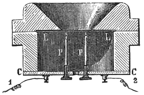 M. Varey’s Microphone Speaker.—M. Varey has recently arranged a successful microphonic speaker, in which the principle of the microphone represented in fig. 39 is maintained. The system of three vertical carbons is arranged inside a sort of snuff-box, of which the lid is made of a thin plate of mica, horn, or ebonite. The snuff-box is provided with two hinged arms, so that it may be placed in the most convenient position for speaking, and at the same time the sensitiveness of the instrument can be regulated. A small battery, consisting of two Gaiffe cells of chloride of silver, is placed in the353 pedestal on which the instrument stands, and sets the microphone at work without further trouble. In this way the speaker can be used like an ordinary telephone, and is not affected by vibrations of air. Only vibrations of sound react upon it.