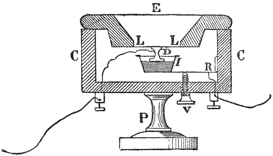 M. Dutertre has also made use of such an arrangement in what he calls the Dolmen microphone. Three pieces of coke in the form of a dolmen, that is, two uprights, supporting a third and horizontal carbon, are placed in circuit. M. Gouault has informed me that speech was well transmitted by this instrument, and it is, like that of Mr. Blyth, which succeeded it, of wonderful simplicity.