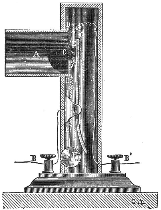 8 M. M. J. Page had already noticed that if a telephone is placed in the circuit of the primary helix of an induction coil, while the secondary helix of this instrument is placed in the circuit of one of M. Lippmann’s capillary electrometers, a movement of the mercurial column of the electrometer takes place at each word, and this movement is effected towards the capillary end of the tube, in whatever direction the current is sent by the telephone. This is because the mercury always tends to move more rapidly at its capillary end than at the other extremity.