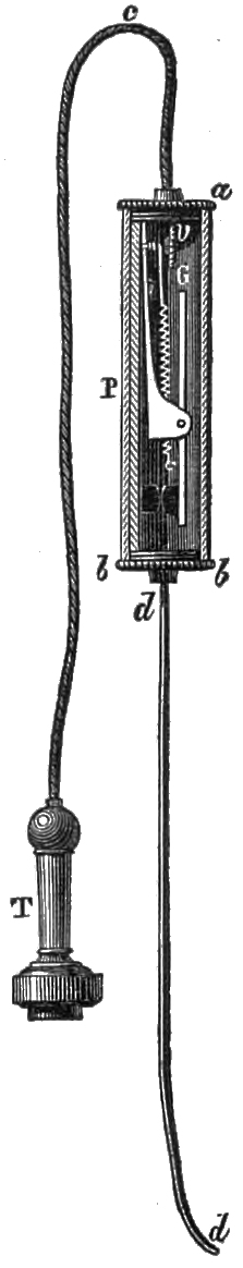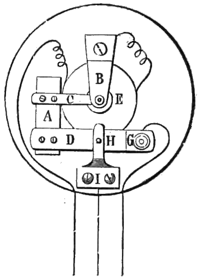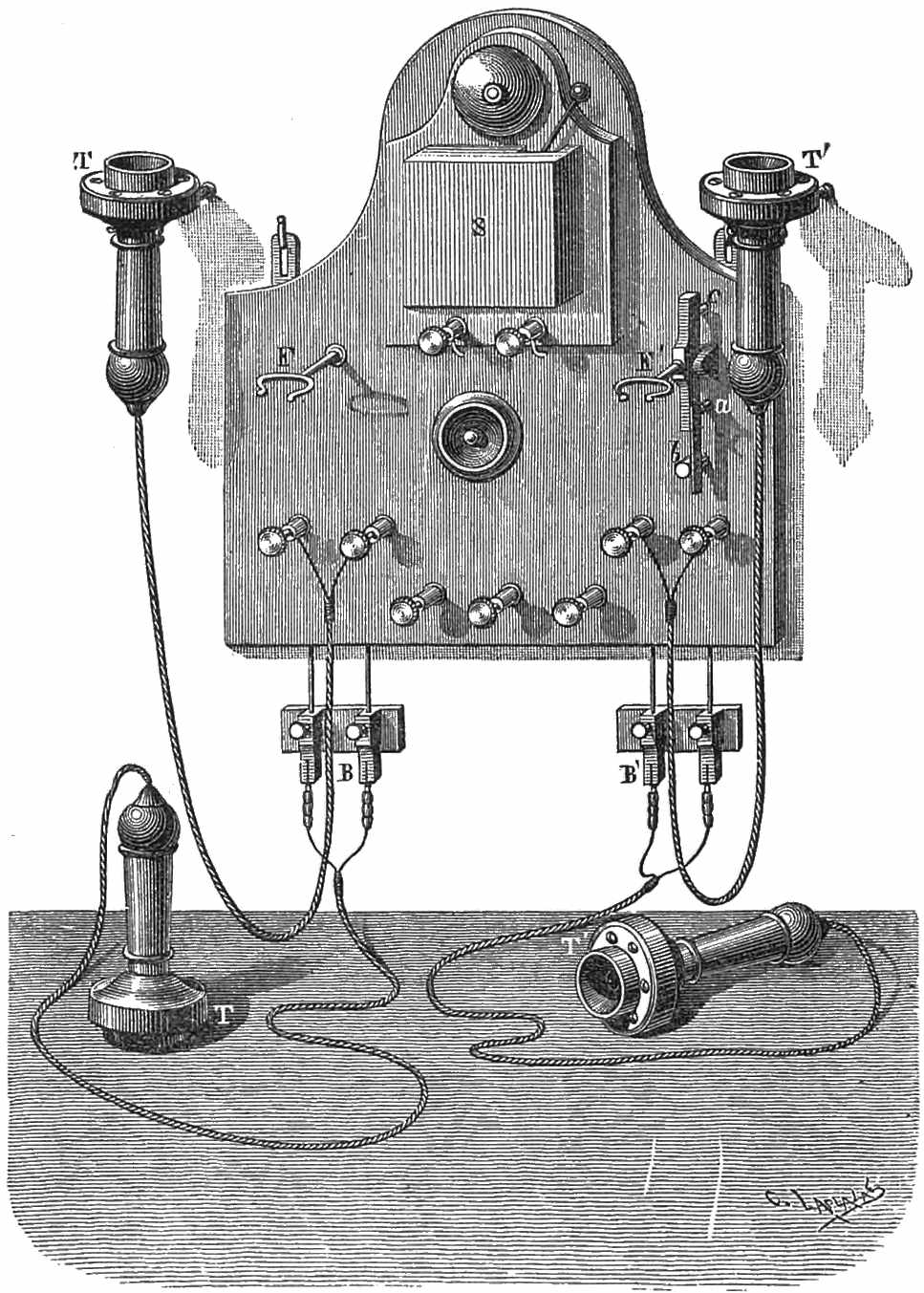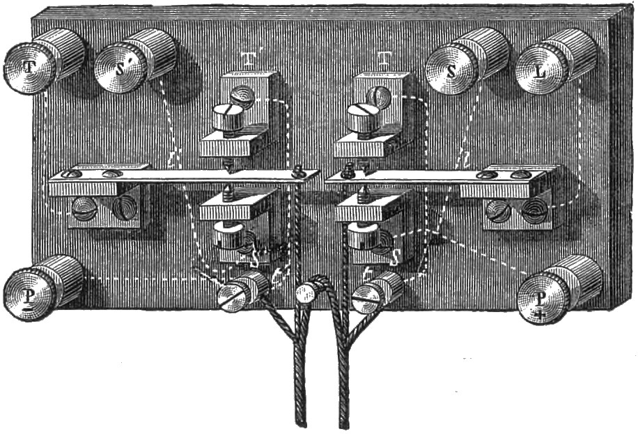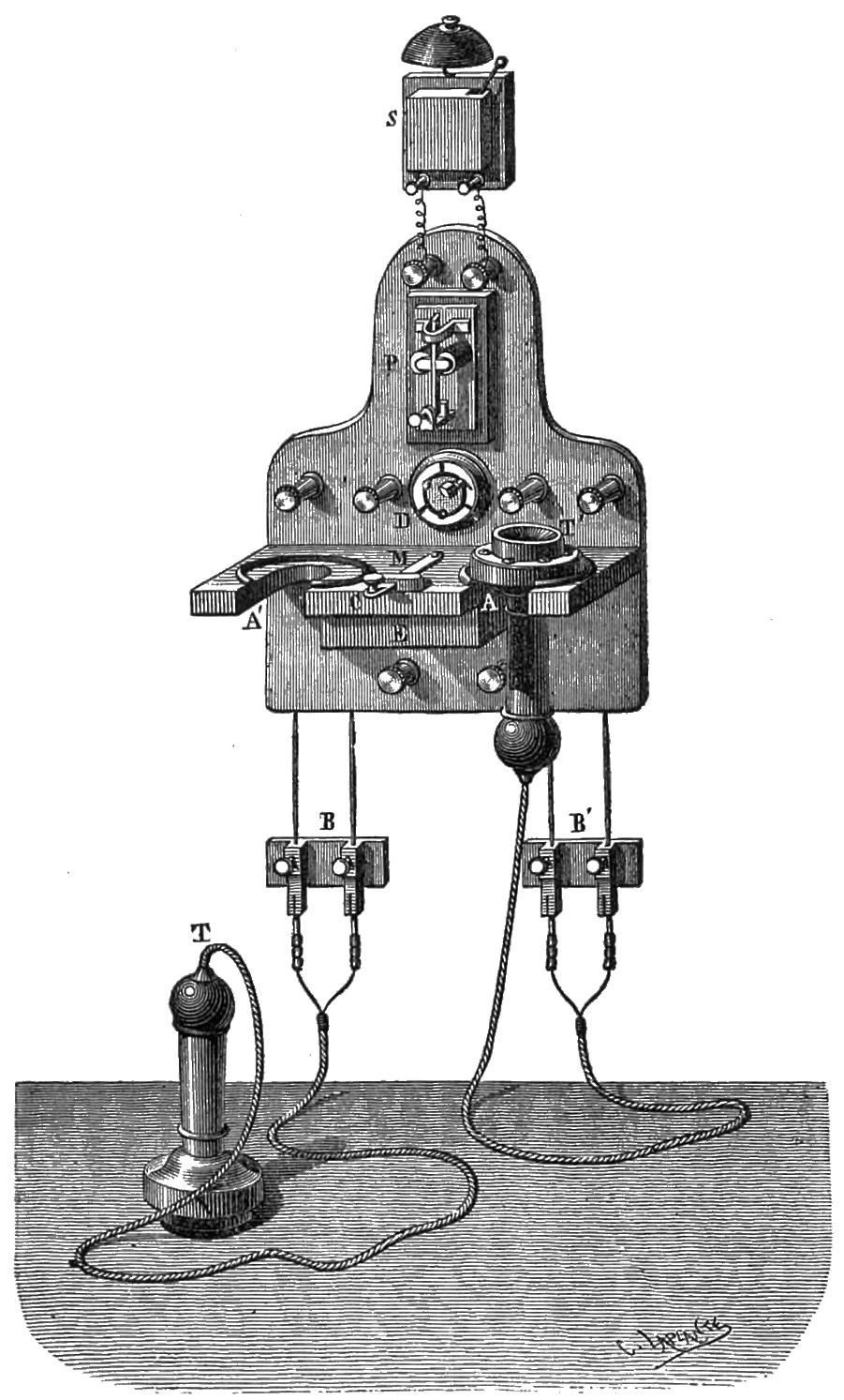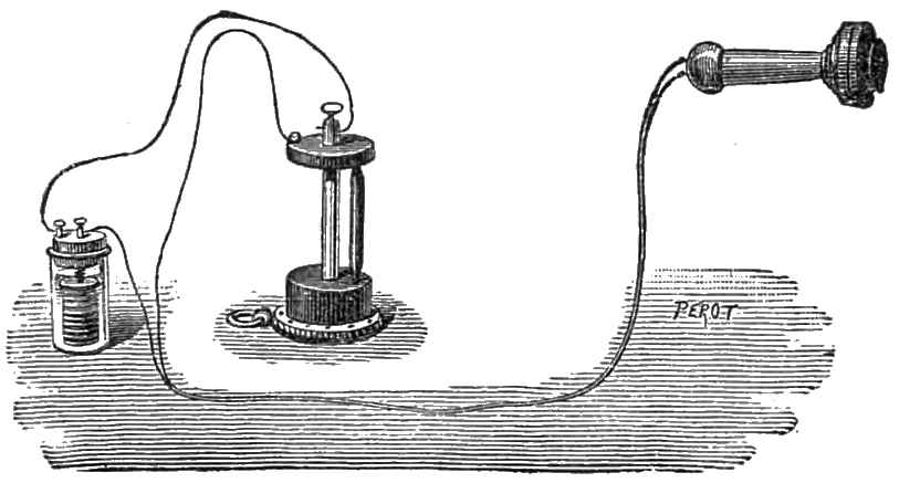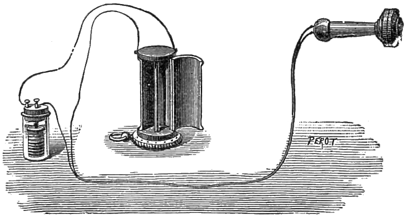 In another arrangement M. Courtot’s mirror telephone has been employed, and a sort of spring pedal is inserted in the wood of the mouthpiece, which terminates in a bent silver wire, supporting an index adapted to make a contact with a square plate soldered to the diaphragm. The battery is placed in connection with the spring of the pedal, and one end of the telephone coil-wire communicates as before with the diaphragm. When a call is to be made, the pedal must be pressed, and the battery immediately communicates with the silver wire which, with the diaphragm, constitutes the vibrator, and an electric vibration is sent through the circuit, and produces the call. For receiving, the pedal is allowed to revert to its normal position, and the index of the pedal, touching the contact in connection with the diaphragm, establishes direct communication between the two telephones, while breaking the contact of the silver wire with the diaphragm, so that the battery cannot act.