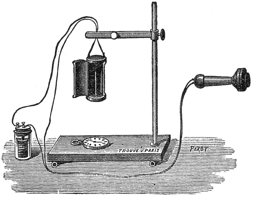 To obtain this result, M. Ader reduced the size of the magnetic core to that of a simple iron wire, one millimètre in diameter, and he fastened it by one of its ends to a small wooden board. Under these conditions, it was enough to fasten a small helix of fine wire on this iron wire, and to apply the board to the ear in order to hear speech distinctly, with the aid of a microphonic speaker actuated by a voltaic current. But the range of sound was considerably increased if a mass of metal was applied to the free end of the iron wire: in this case it was possible to hear when the wooden board was removed to a distance of ten or fifteen centimètres from the ear.