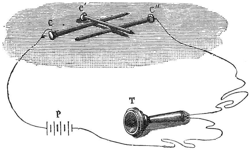 1 Mr. Gray, in an article inserted in the Telegrapher of October 7, 1876, enters into full details of this mode of transmitting sounds by the tissues of the human body, and he gives the following as the conditions in which it must be placed to obtain a favourable result: 1. The electricity must be of a high tension, in order to have an effect perceptible to the ear.