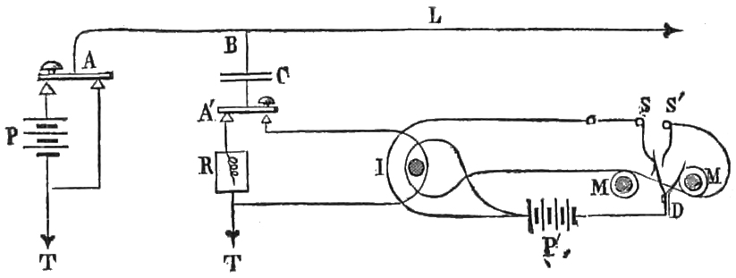An induction coil is necessarily employed for a long circuit, and the effects of induction in the adjacent wires are modified by two rheostats introduced into the circuit at its two extremities.