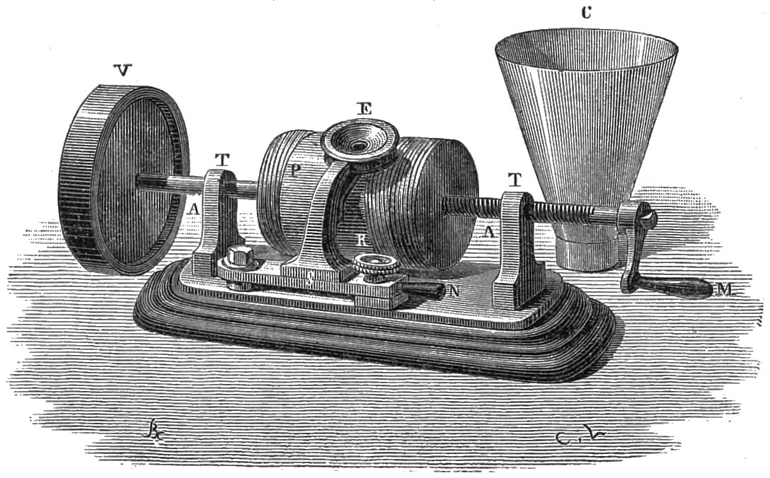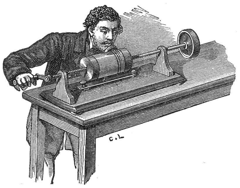 ‘When this is done, this resisting surface is placed in a turning machine which causes it to revolve and advance with a velocity and motion similar to those by which the registering surface was actuated. A metallic point if the tracing is concave, or a grooved index if it is in relief, is kept upon the tracing by a spring, and the index which supports this point is connected with the centre of the membrane which produces the sounds. Under these conditions, the membrane will be actuated not by the vibrating air, but by the tracing which guides the index, and the impulses will be precisely similar in duration and intensity to those to which the registering membrane was subjected.