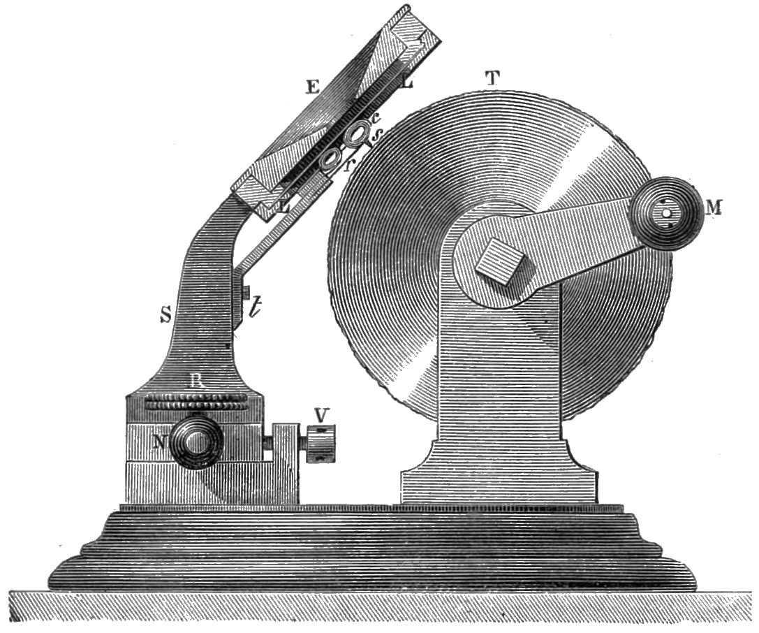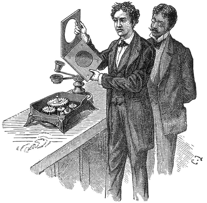 ‘A light index is fastened to the centre of a vibrating membrane; it terminates in a point (a metallic wire or tip of a feather) which rests on a surface which has been blackened by fire. This surface forms part of a disk, to which the double action of rotation and rectilinear progression has been given. If the membrane is at rest, the point will trace a simple spiral; if the membrane vibrates, there will be undulations in the spiral, and these undulations will represent the precise movements of the membrane in their duration and intensity.