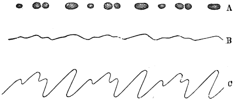 Mr. Fleeming Jenkin goes on to say that the question of the displacement of surface in the diaphragm and magnet is very complex, but that he thinks it impossible to deny the existence of such displacement, since the air which acts as the vehicle of sound between the ear and the source of sound is placed in vibration; yet this displacement maybe effected quite otherwise than by flexion. Suppose that the magnetic molecules of these bodies are drawn together by magnetisation, which tends to diminish the intermolecular space which separates them, the points of surface of the substance corresponding to these intervals will be elevated in a manner equivalent to a displacement of surface, and the effect of this will be the same as a flexion movement. At the moment of demagnetisation a depression instead of an elevation will take place, and the vibratory movements will thus be produced356 without any electro-magnetic attraction, and it is precisely these vibrations which Mr. Fleeming Jenkin terms molecular vibrations. He evidently does not mean that such attractions cannot take place: they may react, together with the molecular vibrations, when the electric force is capable of producing them. He adds that the reproduction of sounds by a condenser, by simple coils, and by a carbon microphone, has convinced him that the action just analysed requires generalisation.