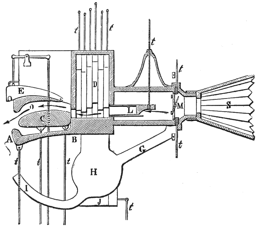 As for the mechanical execution, it is impossible to admire too highly the simple and ingenious manner in which all the complicated movements of the different vocal organs have been connected with the keyboard, of which the mechanism has been so calculated as only to produce the precise action of the organ which is required for any given effect. For this purpose, the notes of the keyboard regularly increase in length, so as to produce at a single touch different mechanical effects on the rods which act upon the mechanism; and since most of the notes are required to react simultaneously on the whole mechanism, the rods which transmit the movement are fastened to a series of jointed levers which cross the notes of the keyboard at right angles. Pegs of different length are fastened to the notes at this junction, so as to produce the simultaneous action of the different organs of the machine.