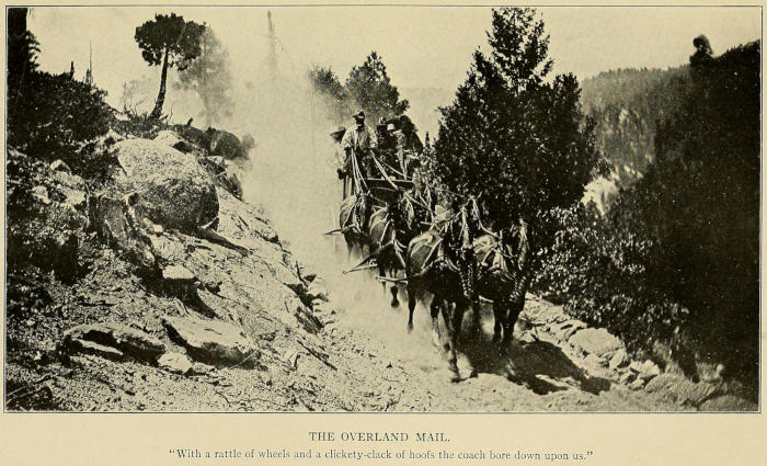 As we were contemplating it in dismal silence we heard the welcome rattle of wheels and clink of harness, and an empty freight wagon, drawn by eight sturdy mules, pulled out of the forest behind us, the bearded “mule-skinner” urging on his beasts with cracking whip and a crackle of oaths. I waded toward him through the mire.