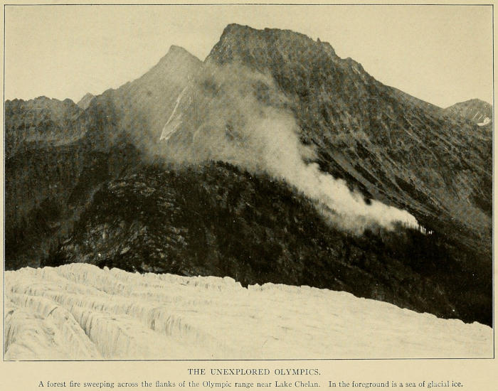 But we did not have to do either, for Duncan, who had previous acquaintance of the place, wasting no time in lamentation, had set to work with his axe and in ten minutes a great fire was sending its hail of sparks into the evening sky. It’s marvellous what wonders can be worked in the wilderness with a sharp axe by a man who knows how to handle it. By stretching the piece of sail-cloth we had with us between two convenient trees and keeping it in place with saplings, in an amazingly brief time Duncan had constructed a shelter which was proof against any but a driving rain, and which, thanks to the camp-fire blazing in front of it, was as warm as a steam-heated room in a hotel. Covering the soggy ground with a layer of hemlock branches, and this in turn with a layer of hay bought from the rancher at five cents per pound, and spreading on top of the hay our rubber sheets and our blankets—behold,[433] we were as comfortable as kings; more comfortable, I fancy, than certain monarchs in the Balkans. We lay side by side beneath the flimsy shelter like sardines in a tin, while outside the rain fell drearily and the night wind soughed in the tree tops, and the flickering flames of the camp-fire alternately illumined and left in darkness everything.