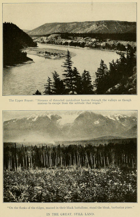 I was particularly impressed throughout our journey across British Columbia with the almost paternal interest the provincial government takes in the welfare of the settlers. On trees and buildings everywhere are posted crown-surmounted notices relating to everything from the filing of homestead claims to the prevention of forest-fires. Rest-houses are maintained by the government along certain of the less-travelled routes; new roads are being cut through the wilderness in every direction; forest-rangers and agricultural experts are constantly riding about the province with open eyes and ears; in every settlement is stationed a government agent from whom the settlers can obtain information and advice on every subject under the sun. Law and order prevail to an extraordinary degree. I was told that there are only three police constables between Ashcroft and Fort George, a distance of more than three hundred miles—and this in a savage and sparsely settled country, where a criminal would have comparatively little difficulty in making his escape. This remarkable absence of crime is due in large measure, no doubt, to the rigid prohibition of the sale of alcoholic liquor within a certain distance of a public work, such as the building of a railway; in fact, the workman is debarred from intoxicants as rigorously as the Indian. “No drink, no crime,” say the authorities, and results have shown that they know what they are talking about. Not until the railway is completed and the construction gangs have moved on are the saloons permitted to throw open their doors. Although[408] this policy unquestionably makes for law and order, it is by no means popular with the workmen, who refuse to consider any place deserving of the name of town until it has obtained a licence. “Such and such a place is a hell of a fine town,” I was frequently assured. “They’ve got a saloon there!” Judged by this standard, Fort George, which is a division point on the Grand Trunk Pacific, at the junction of the Fraser and Nechako Rivers, and will unquestionably become in time a second Winnipeg or Calgary, is a veritable metropolis, for it has considerably more than its share of gin-palaces and booze joints. The poet has vividly described it in a single couplet: