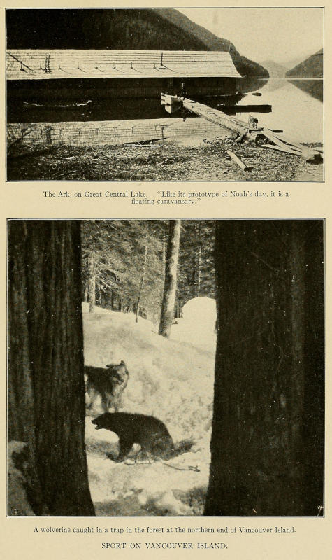 Everything considered, British Columbia is, I believe, the finest game country in the western hemisphere, bar none, for the sportsmen have as yet barely[452] nibbled at its edges. It is to America, in fact, what the Victoria Nyanza country is to Africa: a veritable sportsman’s paradise, to make use of a term which the writers of railway folders have taken for their own. It is the sole remaining region south of Alaska where the hunter can go with almost positive assurance that he will have a chance to draw a bead upon a grizzly bear; mountain sheep and goat are seen so frequently on the slopes of the Rocher de Boulé, at the back of New Hazelton, that they do not provoke even passing comment; the islands off the province’s ragged coast are the only habitat of that rara avis, the spotted bear; musk-ox and wood-buffalo, among the scarcest big game in existence, still graze on the prairies which are watered by the headwaters of the Mackenzie and the Peace; elk, caribou, and mule-deer are as common as squirrels in Central Park; wolves, wolverenes, lynxes, and the fox in all its species, to say nothing of the beaver, the marten, and the mink, still make the province one of the richest fur grounds in the world. Wild fowl literally blacken its lakes and fiords in the spring and autumn; grouse and pheasant, as I have previously remarked, are so tame that they can be and are killed with a club; while salmon, trout, and sturgeon fill the countless streams, sometimes in such vast numbers that they actually choke the smaller creeks and rivers. When there is taken into consideration the fact of its comparative accessibility (New Hazelton can be reached from Seattle in a little more than three days) and the healthfulness of its climate—for[453] British Columbia, unlike most of the other celebrated hunting-grounds, is distinctly a “white man’s country”—it is almost incomprehensible why it has not attracted far greater attention from the men who go into the wild with rod and gun.