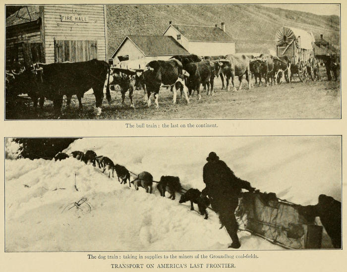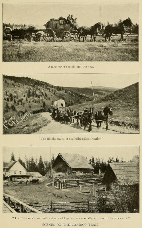 In the great march which substituted the wheat-field for the desert, the orchard for the forest, the work was done by the hardiest breed of adventurers that ever foreran the columns of civilisation—the Pioneers. And the pioneer has always lived on the frontier. Most people believe that there is no longer any quarter of this continent that can properly be[viii] called the frontier and that the pioneer is as extinct as the buffalo. To prove that they are wrong I have written this book. Though the gambler and the gun-fighter have vanished before the storm of public disapproval; though the bison no longer roams the ranges; though the express rider has given way to the express-train; in the hinterland of that vast region which sweeps westward and northward from the Pecos to the Skeena, and which includes New Mexico, Arizona, California, Oregon, Washington, British Columbia, frontier conditions still endure and the frontiersman is still to be found. In the unexplored and unexploited portions of this, “the Last West,” white-topped prairie schooners—full sisters of those which crossed the plains in ’49—creak into the wilderness in the wake of the home seeker; the settler chops his little farmstead from the virgin forest and rears his cabin of logs from the trees which grew upon the site; mile-long pack-trains wend their way into the northern wild; six-horse Concord coaches tear along the roads amid rolling clouds of dust, their scarlet bodies swaying drunkenly upon their leathern springs; out in the back country, where the roads run out and the trails begin, the cow-puncher still rides the ranges in his picturesque panoply of high-crowned Stetson and Angora chaps and vivid shirt. But this is the last call. It is the last chance to see a nation in the primeval stage of its existence. In a few more years, a very few, there will be no place on this continent, or on any continent, that can truthfully be called the frontier, and with it[ix] will disappear, never to return, those stern and hardy figures—the pioneer, the prospector, the packer, the puncher—who won for us the West.