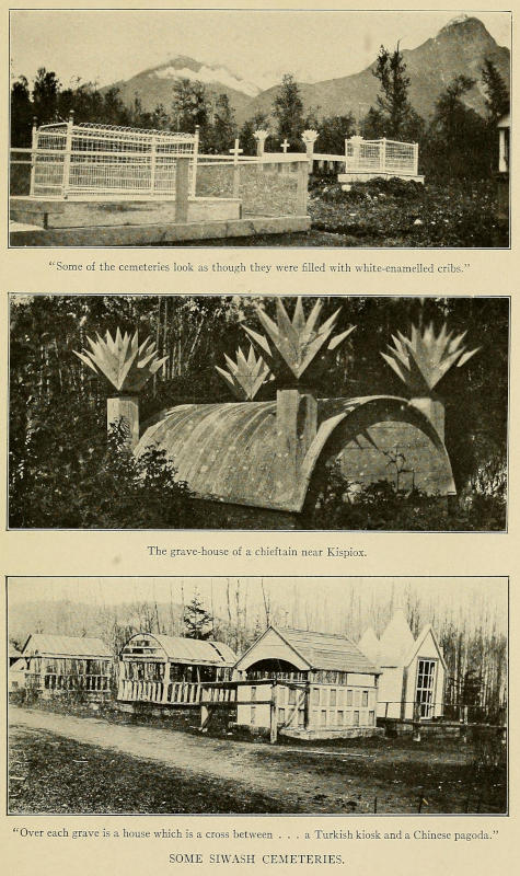 The Siwashes bury their dead in some of the strangest cemeteries in the world, over each grave being erected a grave house of grotesquely carved and gaudily painted wood, which is a cross between a dog kennel, a chicken-coop, a Chinese pagoda, and a Turkish kiosk. In these strange mausoleums the personal belongings and gewgaws of the dear departed are prominently displayed. It may be a trunk or a dressing-table, usually bedecked with vases of withered flowers; from a line stretched across the interior of the structure hang the remnants of his or her clothing, and always in a conspicuous position is a photograph of the deceased. Though sometimes several hundred dollars are expended in the erection of one of these quaint structures, as soon as the funeral rites are over the tomb is left to the ravages of wind and rain, not a cent being expended upon its up-keep. Of recent years, however, those Indians who can afford it are abandoning the old-time wooden grave houses for elaborate enclosures of wire netting which gave the[450] cemeteries the appearance of being filled with enamelled iron cribs. Perhaps their most curious custom, however, is that of potlatch giving. A potlatch is generosity carried to the nth degree. Some of them are very grand affairs, the Indians coming in to attend them from miles around. It is by no means unusual for an Indian to actually beggar himself by his munificence on these occasions, a wealthy chieftain who gave a potlatch recently at Kispiox piling blankets, which are the Indians’ chief measure of wealth, around a totem-pole to a height of forty feet.