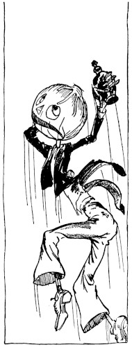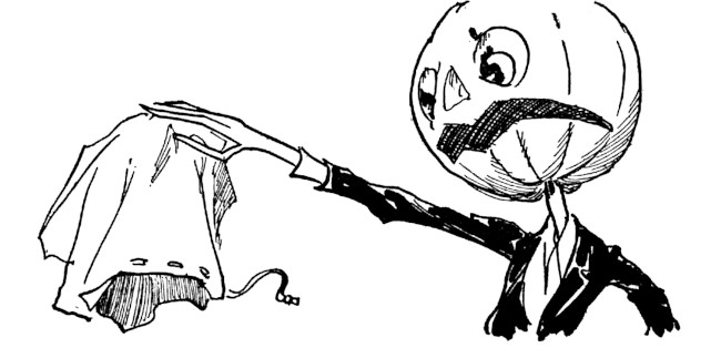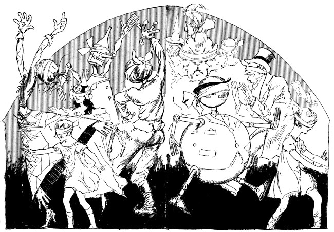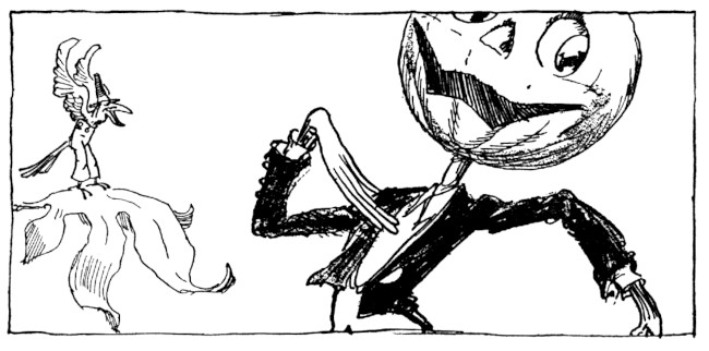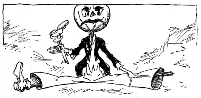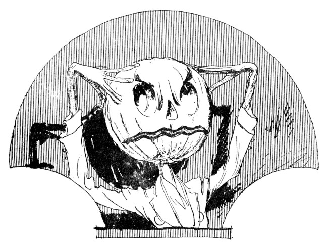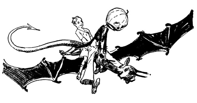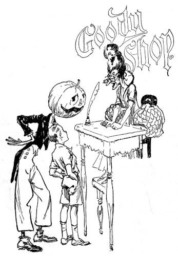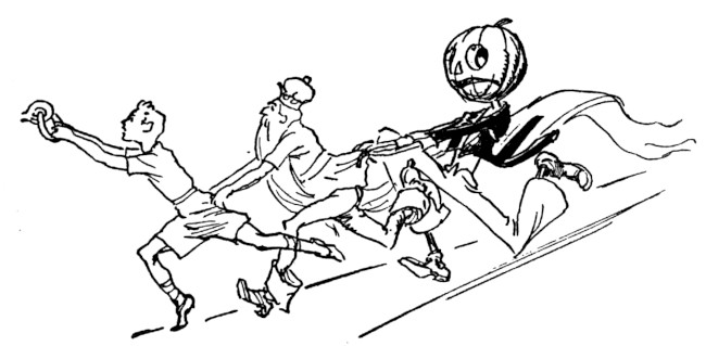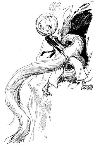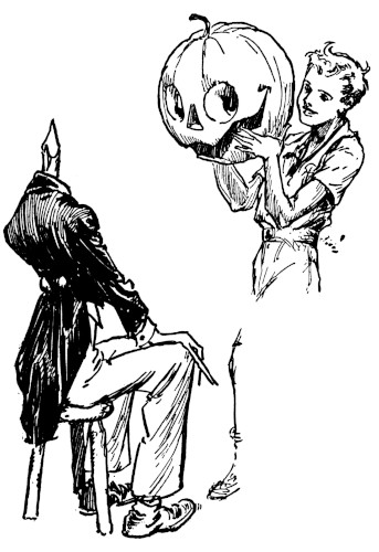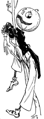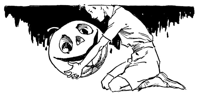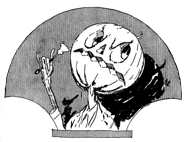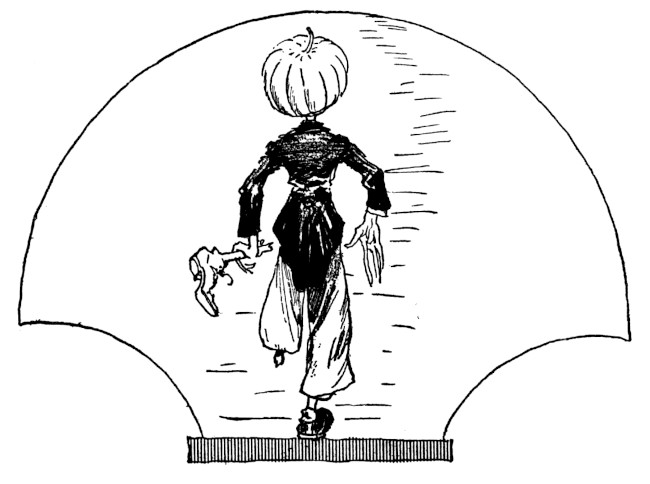 "My body has fallen down the stairs," observed the pumpkin head calmly. "It should have waited for me, for nobody should be without a head." Peter agreed heartily with this last statement and, setting the head on the table, he pulled the awkward figure to its feet and then, standing on a chair, pressed the head carefully on the wooden peg that served for a neck.