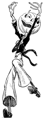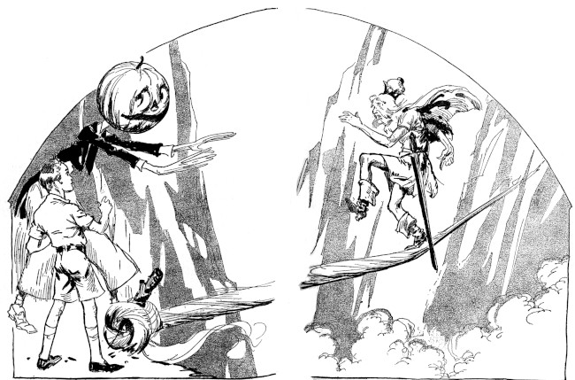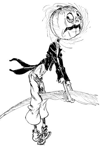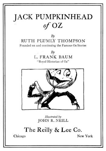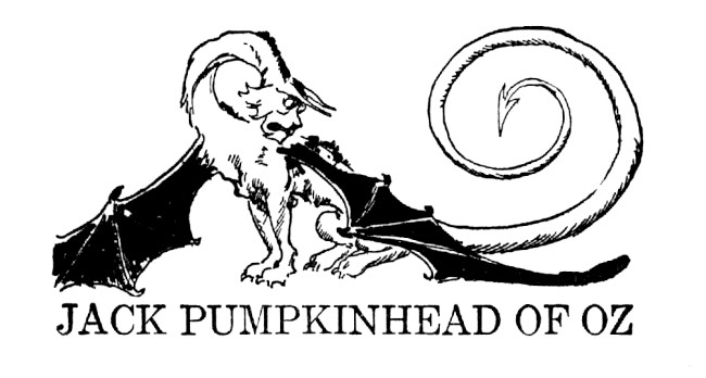 "Ozma was not always a girl," explained Jack mysteriously. "Once Ozma was a boy like you. I see you have never heard my strange story," finished Jack in a hurt voice—looking reproachfully down at Peter. Though Peter had met Jack Pumpkinhead at Ozma's palace he had to admit that he knew nothing of his interesting history. So, as they sauntered slowly along the highway, Jack told how Ozma, as a baby had been stolen by Mombi, the witch, and transformed into a boy named Tip. For nearly nine years, Tip had lived in Mombi's hut, entirely ignorant of the fact that he was the real ruler of Oz. It was to scare Mombi that Tip had first manufactured the Pumpkinhead Man. Jack's wooden arms and legs had been skillfully carved from strong saplings. His body, made of a tough piece of bark, was pinned together with wooden pegs. A larger peg served Jack for a neck and a carved pumpkin made his head. With some old clothes he found in Mombi's attic, Tip had dressed the queer figure and stood him in the bend of the road to scare the old witch on her return from a visit to the crooked wizard's.