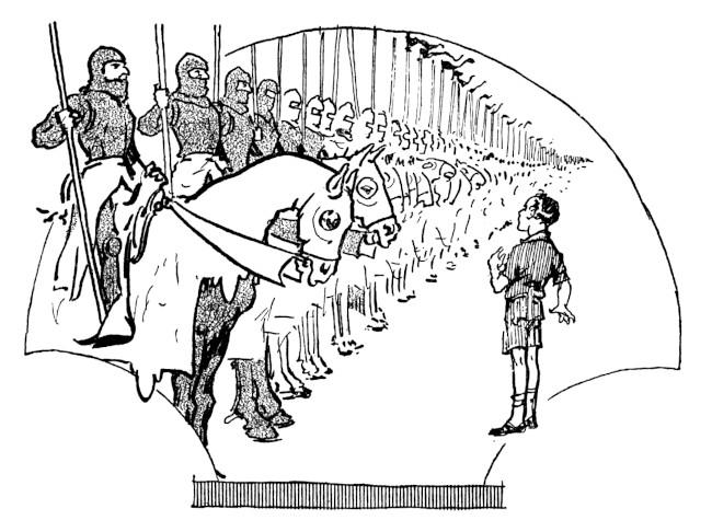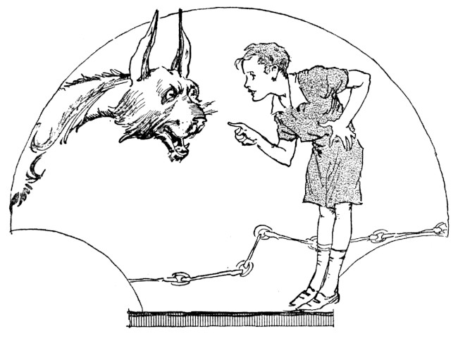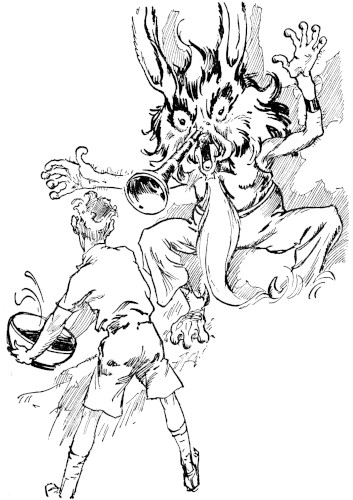 "Why it's Peter!" roared Sir Hokus, disentangling himself from ten Scares and hurrying over to the little boy who had just tumbled out of the sack. "Peter, the pitcher—and—" Thumping Scares both left and right, the Good Knight looked doubtfully at the Iffin and Belfaygor, who had rolled out of the bag after Peter himself. "Who are these?" muttered Sir Hokus, making ready to whack the great red monster if it showed signs of attack.