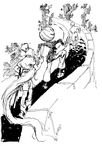 "I am looking out," it called cheerfully, as it turned over and over in the air. "That's just the trouble! Catch my head will you?" And next minute Peter found himself clasping a large pumpkin head in both arms.
