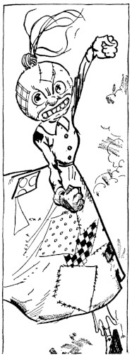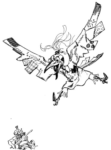 "I command this ridiculous maiden to become a bird," called Mogodore in a loud voice. And instantly, Scraps was a bird, an exceedingly scrappy bird, too. Wildly flapping her patchwork wings she quickly disengaged herself from the gold chains that bound her to the tree. Then swooping down upon Mogodore, she snatched Ozma's crown from his head and hurled herself into the air.