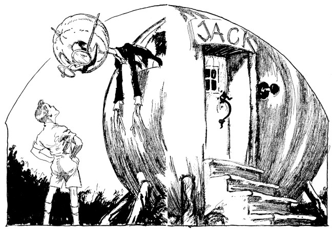 It was shaped like an enormous hollowed out pumpkin, but had several windows and a front door, so Peter walked boldly up the steps and knocked twice. He could hear footsteps running about inside and presently a head was thrust out the second story window.