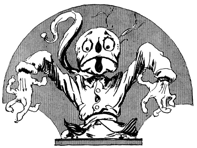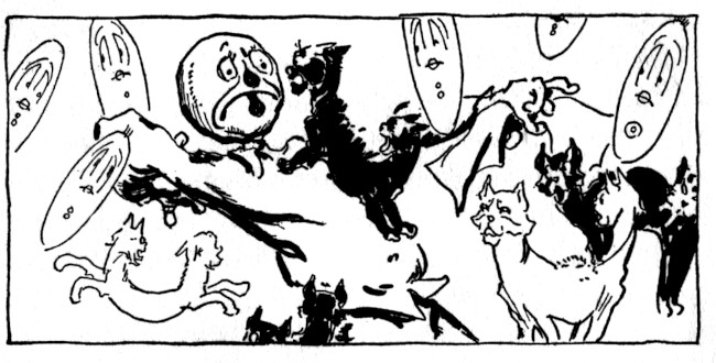 "Is it a nightmare?" shivered Betsy, clutching Trot's arm, "or a Hallowe'en party? Am I really here, and are they?" And well might she ask, for the last shake of the pirate's sack had filled the room with Fraid Cats and Scares. Screaming, groaning snatching at one another and the Oz folk, the Scares swarmed this way and that, until the confusion was terrible.
