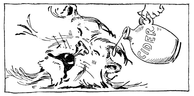 "Jack! Jack!" panted Ozma, "have you come to save us?" Solemnly Jack nodded and before a man at the table could move, he whisked off his head, set it on a chair and then and not till then did he hurl the forbidden flagon straight at the Baron of Baffleburg. How he ever managed to aim so true without his head to help him I have no idea, but with a resounding crack the flagon splintered to bits on Mogodore's nose and a thin red liquid began to pour down his cheeks and drop off his chin.