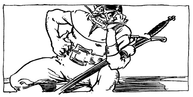 "Surrender, villains," bellowed Sir Hokus, glaring around furiously. "Where is that braggart Baron!"