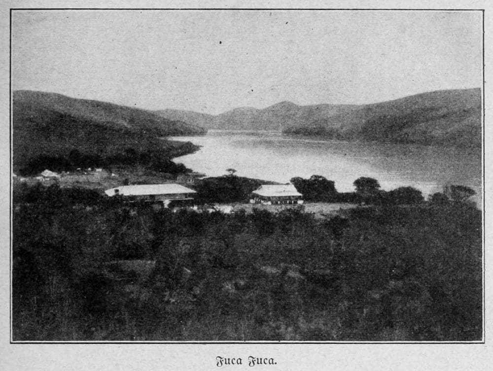 Morgens 1/2-5 Uhr erwachte ich vom Lärm und Getrappel an Bord. Ich begab mich sofort an Deck, und das Panorama, das sich vor meinen staunenden Augen entrollte, war ein geradezu überwältigendes. Hinter den ersten Felspartien, deren Umrisse bereits in der Nacht sichtbar waren, erhob sich Spitze auf Spitze, Gebirge auf Gebirge, die höchsten Spitzen teils noch von Wolken eingehüllt. Arenenartig sind auf den verschiedenen Kuppen und Höhen kleine Forts errichtet, deren Kanonen in der aufgehenden Sonne blinkten. Bald erschien eine Unmenge kleiner Boote, deren braune Insassen wie Affen zu uns an Bord kletterten; und nun begann ein[S. 19] Schnattern und Feilschen dieser kleinen Gesellen, um uns in ihren Nußschalen an Land zu bringen. Da wir bis 1 Uhr mittags hier liegenblieben, um Kohlen einzunehmen, begab ich mich mit drei Reisegefährten, einem schwedischen Hauptmann, meinem holländischen Afrikaner Lukas und Baron Misco, einem Italiener — in späteren Jahren Staatsprokurator des Kongostaates — in einem dieser kleinen Boote an Land.