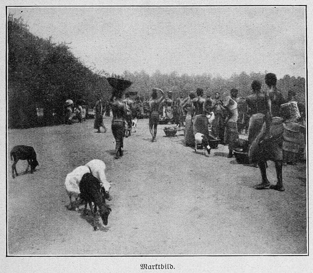 Wir besuchten den Fruchtmarkt, wo tausende Bushels Bananen, Ananas, grüne Feigen, Kürbisse, Melonen und Mangos, die die Landbevölkerung aus dem Innern auf Mauleseln und Tragtieren herangebracht, von europäischen Händlern aufgekauft werden, um mit dem nächsten Dampfer über England nach dem Kontinent weiterzuwandern. Hinter den zu Bergen aufgehäuften Früchten stehen die Verkäuferinnen, ganz nach orientalischer Art in wallende weiße Tücher gehüllt, und bieten ihre Waren mit lautem Geschrei aus.