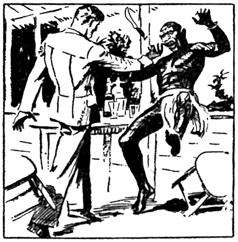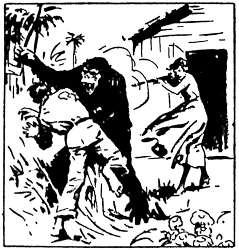 On the hotel veranda the black spied Tarzan. With a roar he charged the ape-man. Tarzan met the rush; his steel muscles gripped the black wrist of the uplifted knife hand, a single wrench left the hand dangling below a broken bone. Crying with agony, the fellow ran away. Tarzan resumed reading.
