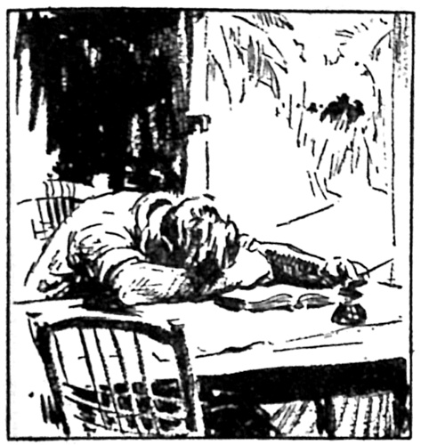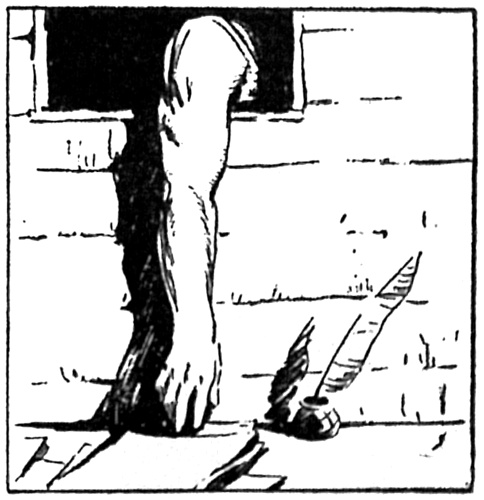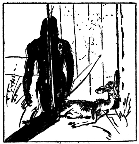 D'Arnot threw himself face downward on the cot.... An hour later he started up, listening. Someone at the door... trying to enter.... Dusk was falling. His hair rose on his scalp.... He reached for the loaded rifle.... Gently the door opened.... Something stood just without.... And then d'Arnot pulled the trigger.