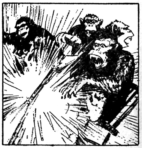 The other apes sat huddled together watching their chief. Suddenly Kerchak's finger closed upon the trigger. There was a deafening roar! The apes fell over one another in their wild anxiety to escape. Kerchak, equally frightened, but still clutching the rifle, sprang through the door, which shut tightly after him.