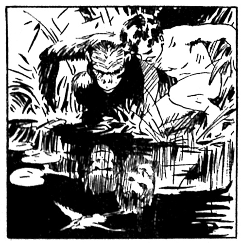 In the higher land that the tribe frequented was a little lake. Here it was that Tarzan first saw his face in the clear, still waters of its bosom. He was appalled! He turned red with shame as he compared his face and naked body with his more fortunate brother's.